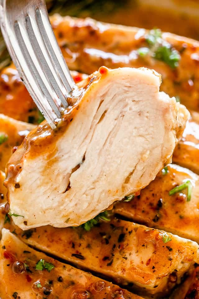Pour the prepared honey mustard sauce over the chicken breasts, turning the chicken over to cover each chicken breast entirely.