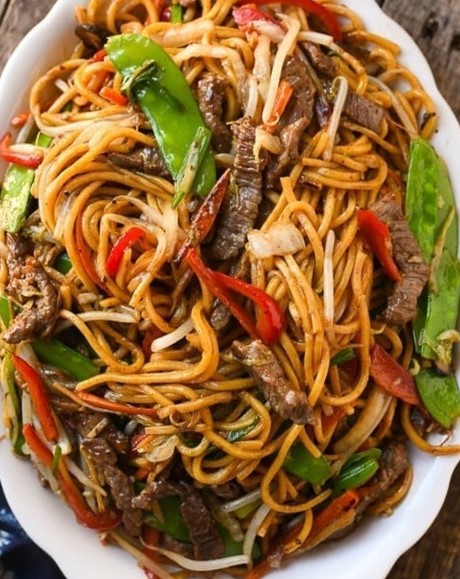 Next, add the snow peas, mung bean sprouts, and beef (along with any juices that may have collected in the bowl). Continue stir-frying until the noodles are heated through and everything is thoroughly mixed.